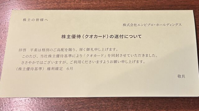 日本株エンビプロHD【5698】から株主優待のQUOカードが届きました 2025年10月12日 masa 高卒:FIRE目指してみた エンビプロHDから株主優待が届きました 先日、エンビプロ・ホールディングス(5698)から株主優待のQUOカード2,000円分が届きました …