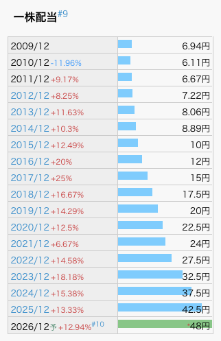 特筆すべきは、その増配のペースです。 毎年の増配率は10%を超えています。これは複利的に資産が増えていくことを意味します。
