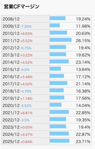 ここで、少し専門的な指標になりますが、私が最も注目したのが「営業キャッシュフローマージン」です。