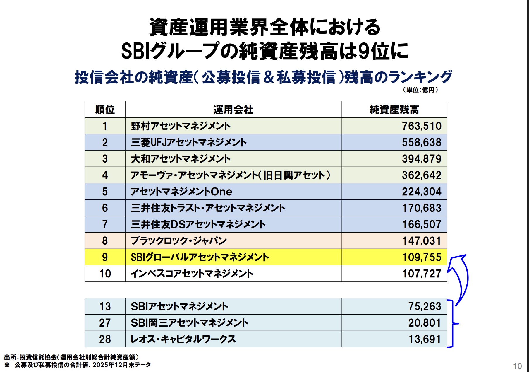 こうしたメガヒットを連発した結果、SBIグループの運用残高は、歴史ある昔ながらの巨大な金融グループをごぼう抜きして、日本の資産運用業界で「堂々の9位」に浮上しました。まさに、業界の勢力図を塗り替える「次世代のトップランナー」としての地位を完全に確立したと言えます。
